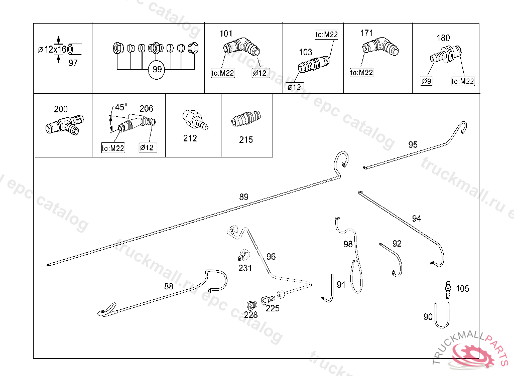 ELBOW FITTING COMPRESSED-AIR-LINE PLUG-CONNECTION TO M 22, 12 MM, 45 GRAD, VOSS 232