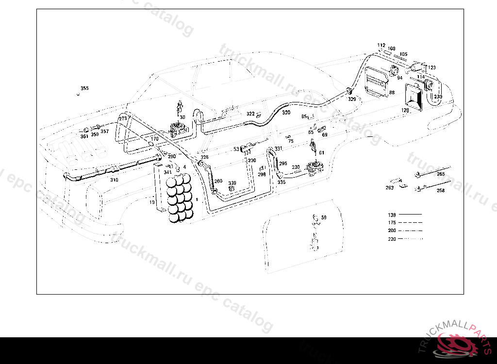 HOSE FROM DISTRIBUTOR ON RIGHT FRONT PANEL PILLAR TO ELEMENT ON REAR LID 4370 MM, ORDER BY THE METER 114.010,021,022 UNTIL PRODUCTION STOP, 114.011 UP TO CHASSIS 108425, 114.015,017 UP TO CHASSIS 245853, 114.023 UP TO CHASSIS 100866 AND FOOTN.63