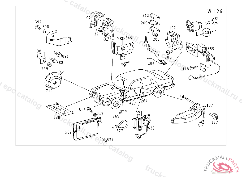 DOOR HANDLE LEFT FRONT DOOR, WITH SPECIAL LOCK, 126.021 024130 ALSO INSTALLED ON 024568-024856 126.022,023 082490 ALSO INSTALLED ON 085384-086403 126.032,033 042921 ALSO INSTALLED ON 043448-043816 126.036,037 031317 ALSO INSTALLED ON 032054-032495 126.120 042492 ALSO INSTALLED ON 043412-044100