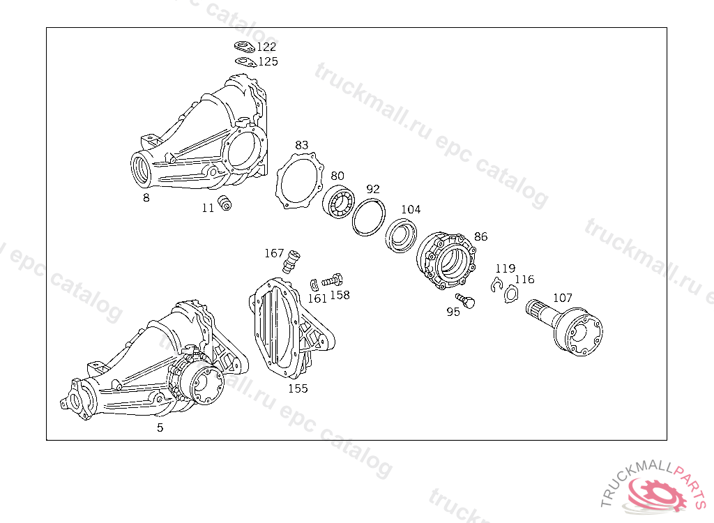 SPACER WASHER AS REQUIRED 2.6 MM, REAR AXLE HOUSING WITH DIFFERENTIAL AND WITH SIDE BEARING CAPS 003 103238 007 087550 086 007105 093 008991 102,103 240182 105 231728 183 015394 190 021956 193 002092 200 027294 280 000776 283 003631