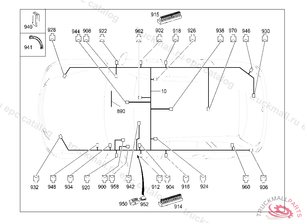 WIRING HARNESS FRAME FLOOR UNIT MAIN CABLE HARNESS, STATE IDENT NO. WHEN ORDERING THE CORRESPONDING SPECIAL EQUIPMENT IS CONTAINED IN THE WIRING HARNESS ACCORDING TO THE VEHICLE PRODUCTION NUMBER