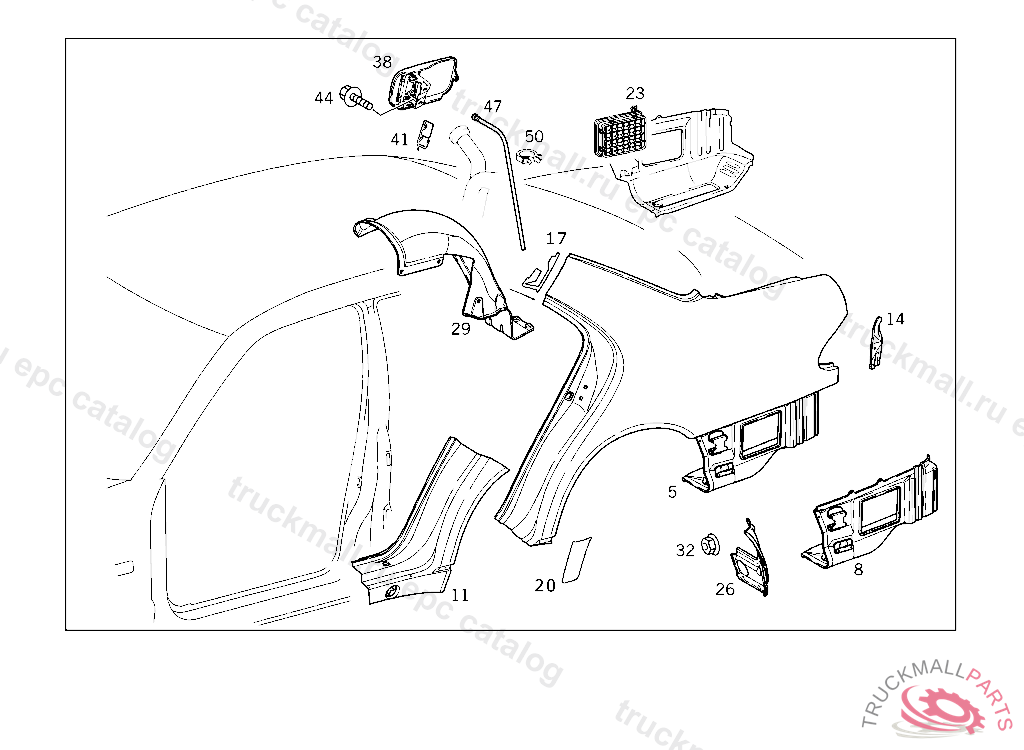 REAR FENDER , FIRST EXHAUST STOCK OF OLD PARTS UP TO IDENT NO. A 071317 J 012091 ORDER ADDITIONALLY: 1 X 210 682 08 30 ISULATION RIGTH, Replaced By: A2106301621
