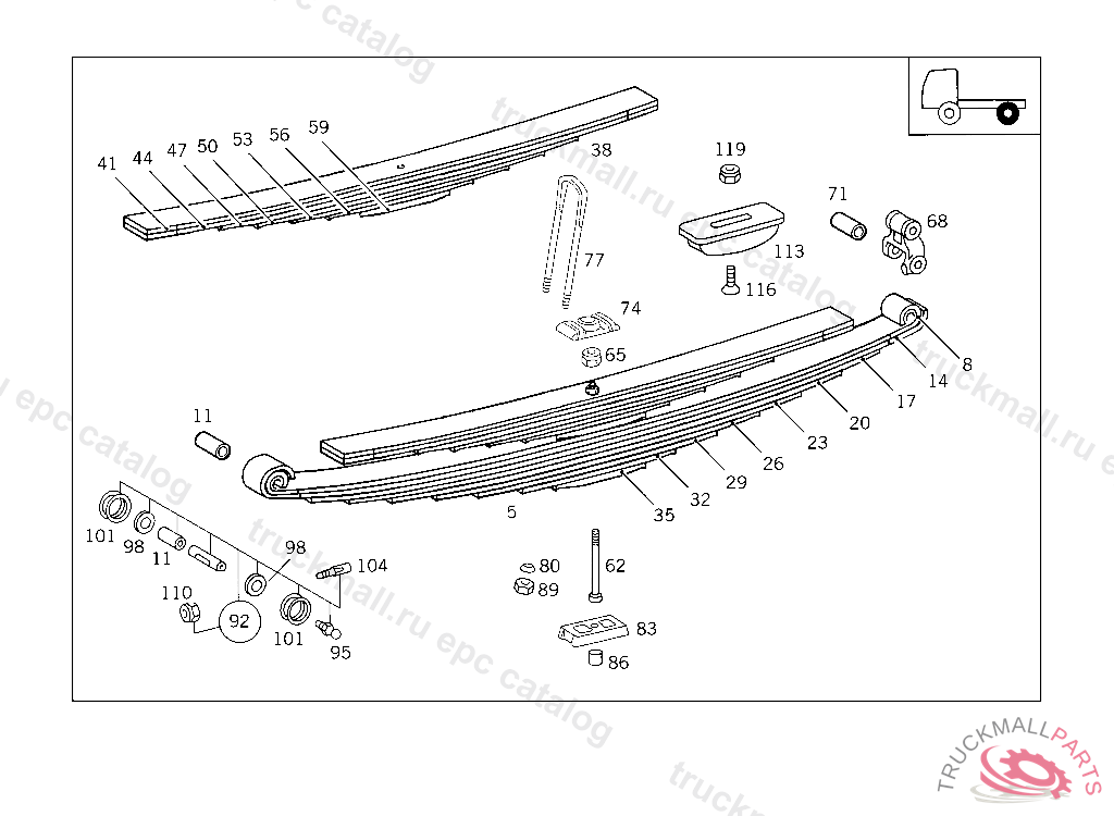 REAR SPRING 9-LEAF,WITH 7-LEAF HELPER SPRING, 385 991 04 64 SHEAR BUSHING TO BE ELIMINATED UP TO CHASSIS 4 889187, SEE SERVICE INFORMATION 32/8