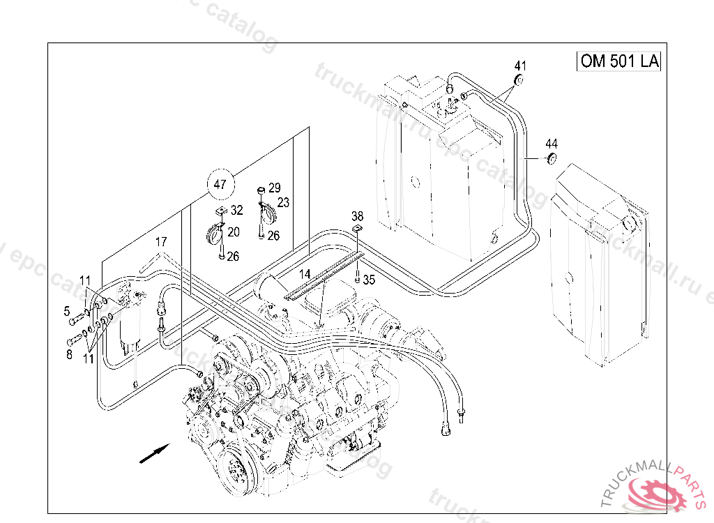 CLAMP DELIVERY AND SUCTION LINES TO ENGINE, FRONT