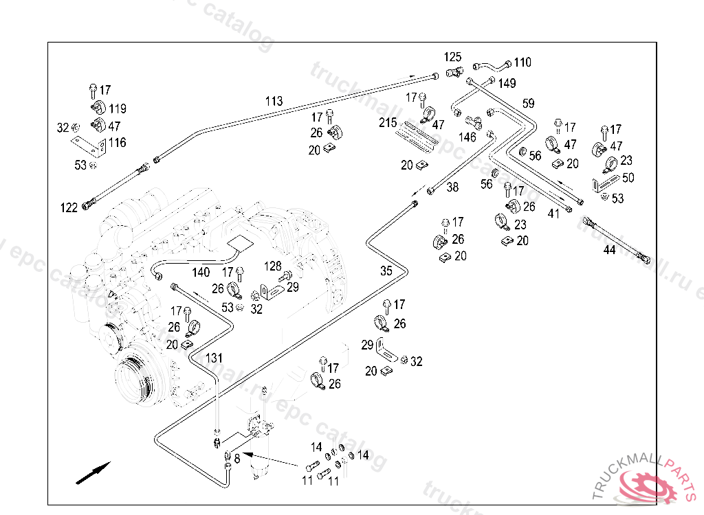CLAMP DELIVERY AND SUCTION LINES TO ENGINE, FRONT