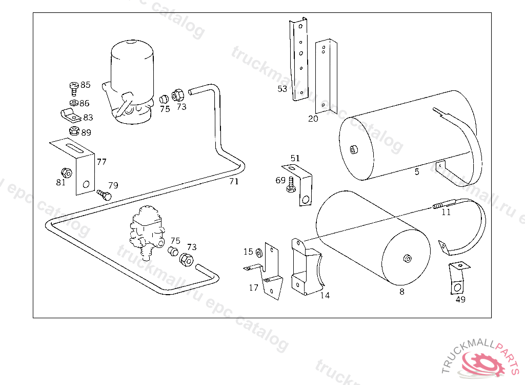 COMPRESSED AIR RESERVOIR. RESERVOIR6 L, TO VOSS 232, FOR VEHICLES WITH VOSS 230 CONNECTOR:ADD. MOUNT FITTING "A 004 997 82 72" WITH O-RING "A 000 987 04 46" AND THRUST RING "A 000 997 02 03" TO AIR RESERVOIR