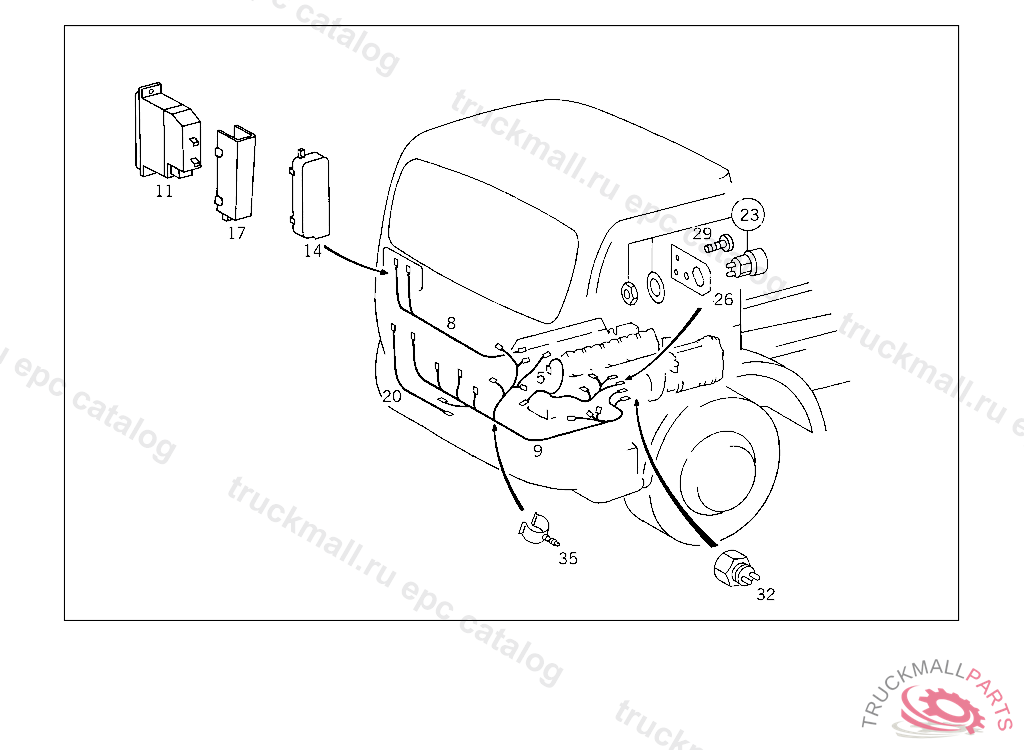 ELECTRIC CABLE FROM MODULE "M" TO ENGINE PLUG-CONNECTION AND TO CRUISE CONTROL SERVOMOTOR, THIS CABLE HARNESS IS A COMPONENT OF FRAME MOUNTED CABLE HARNESS ASSEMBLY AND CAN BE MADE AVAILABLE AS A SPARE ATTENTION: WHEN PLACING ORDERS, PLEASE QUOTE VEHICLE IDENT NO. ONLY IF FRAME MOUNTED CABLE HARNESS IS REQUIRED AS AN ASSEMBLY