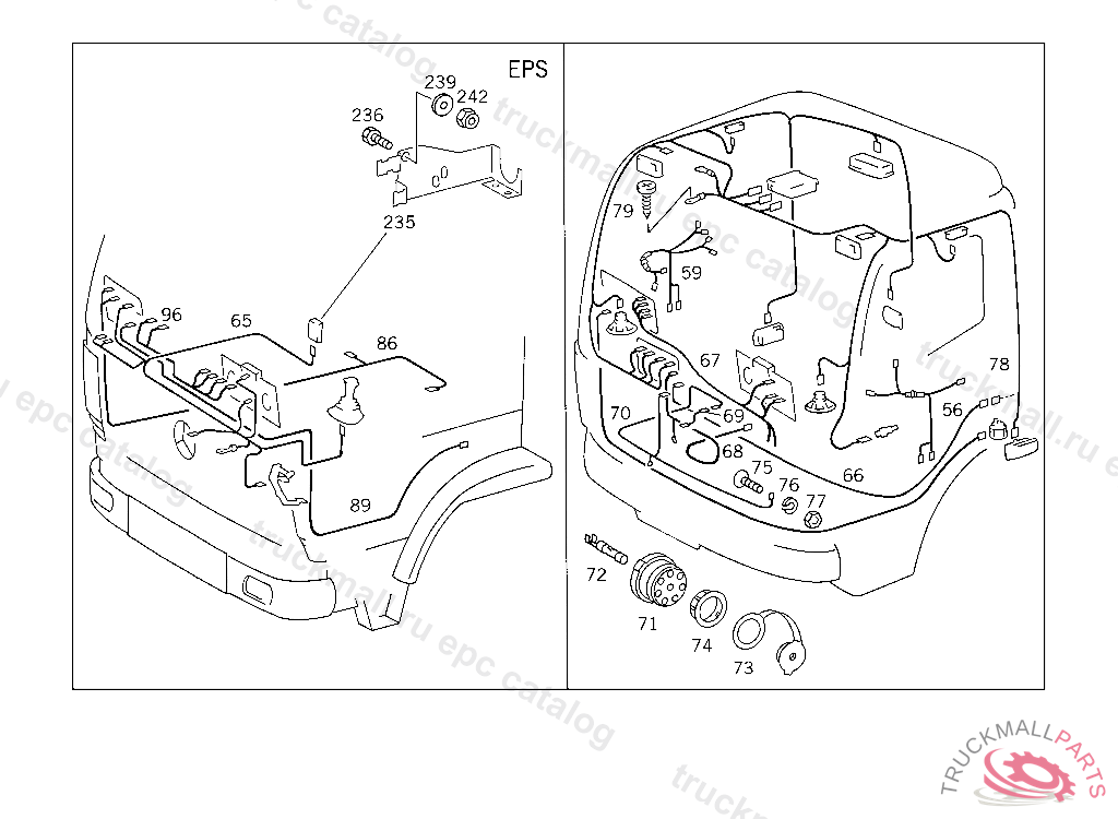 CABLE HARNESS FROM CHASSIS PLUG CONNECTION TO TRANSMISSION PLUG CONNECTION EPS-E, THIS CABLE HARNESS IS A COMPONENT OF FRAME MOUNTED CABLE HARNESS ASSEMBLY AND CAN BE MADE AVAILABLE AS A SPARE ATTENTION: WHEN PLACING ORDERS, PLEASE QUOTE VEHICLE IDENT NO. ONLY IF FRAME MOUNTED CABLE HARNESS IS REQUIRED AS AN ASSEMBLY5 957780K 041928