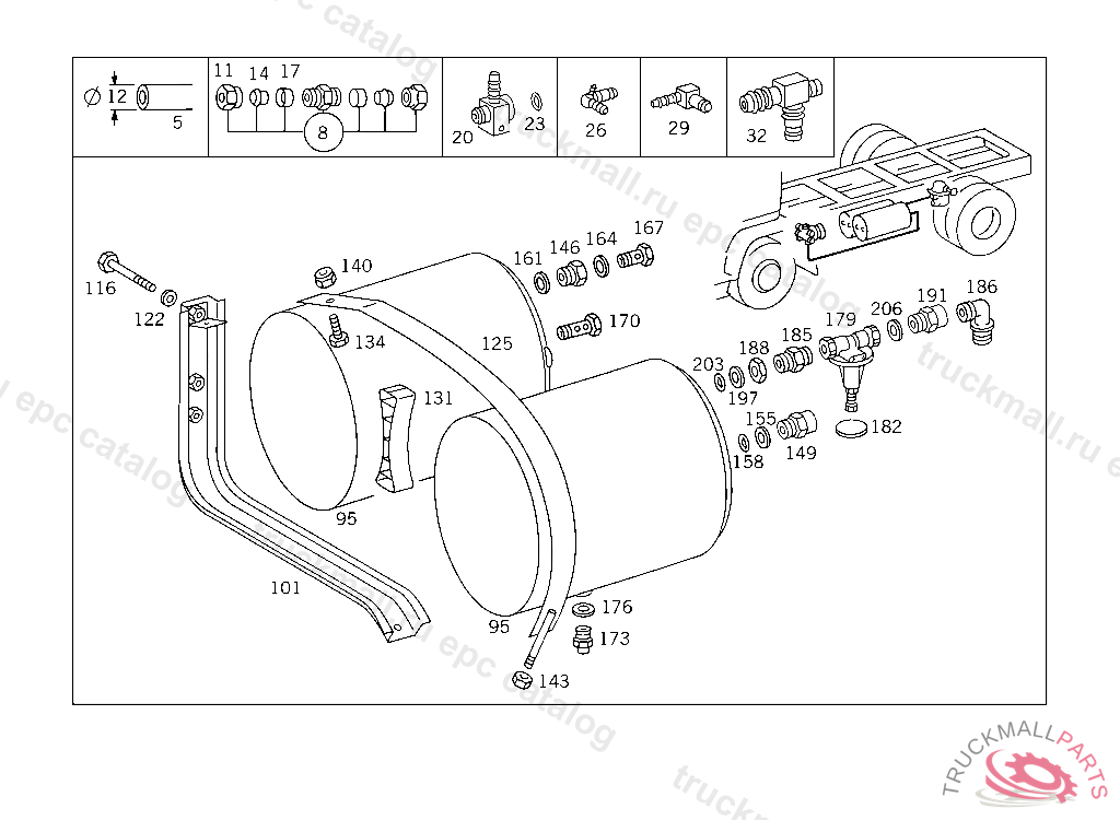 RESERVOIR COMPRESSED AIR 20 L, TO VOSS 232, FOR VEHICLES WITH VOSS 230 CONNECTOR: ADD. MOUNT FITTING "A 004 997 82 72" WITH O-RING "A 000 987 04 46" AND THRUST RING "A 000 997 02 03" TO AIR RESERVOIR