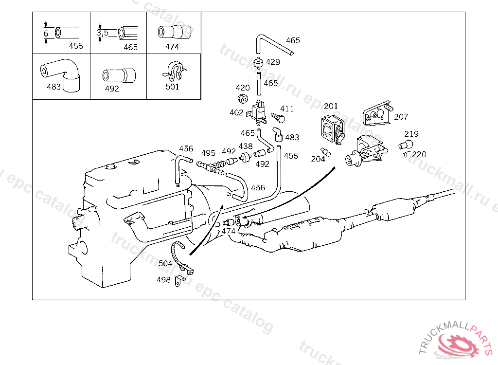 HOSE ENGINE TO REGENERATION VALVE RECHTS, F 125158 EXCEPT CODE 805 ALSO INSTALLED IN VEHICLE TO F 125157 WITH CODE 806