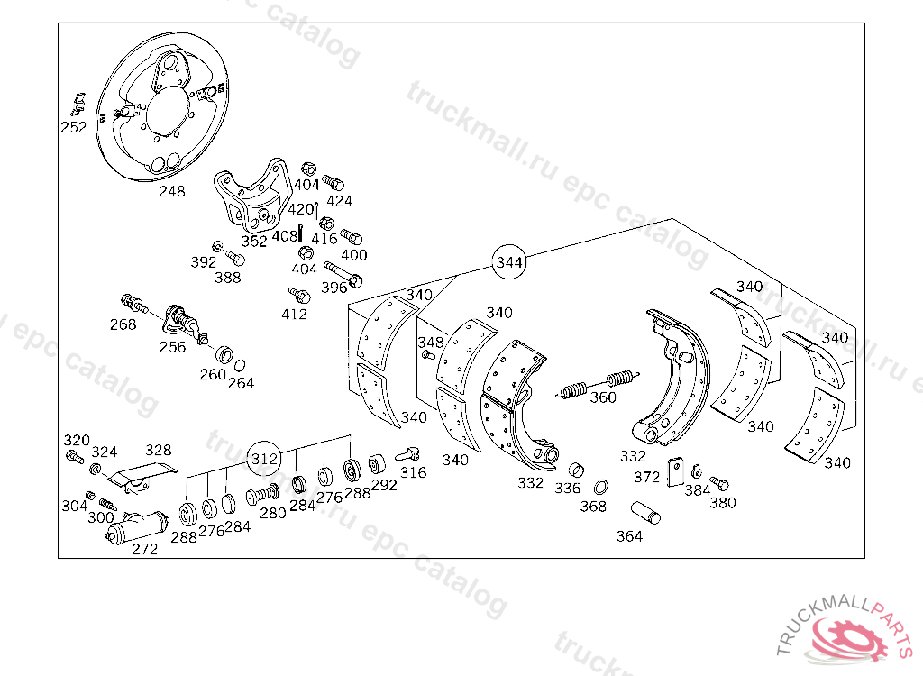 BRAKE ANCHOR PLATE RIGHT WHEEL CYLINDER, 344.032,033,040,041,132,133,140,141 FROM FRONT AXLE 1915445, 344.055,057,058 FROM FRONT AXLE 1903740 344.030,032,033,040,041,057,058 UP TO IDENT NO. 415524, FROM IDENT NO. SEE SPARE PARTS LIST 732.7