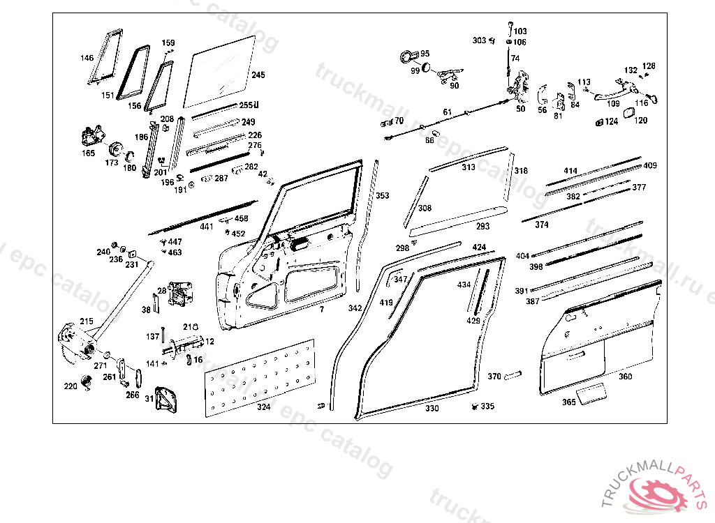VENTILATOR WINDOW RIGHT, 000,001,004,010 UP TO CHASSIS 123344,100,101,104,110 UP TO CHASSIS 204483,UPPER PIVOT PIN TO BE SHORTENED BY 3 MM