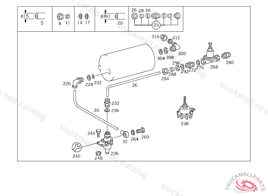 NUT TWO-CIRCUIT BRAKE VALVE,CONNECTIONS: "21,22", 620.415 UP TO CHASSIS 5 014668 620.416 UP TO CHASSIS 5 000515 620.417 UP TO CHASSIS 4 972023