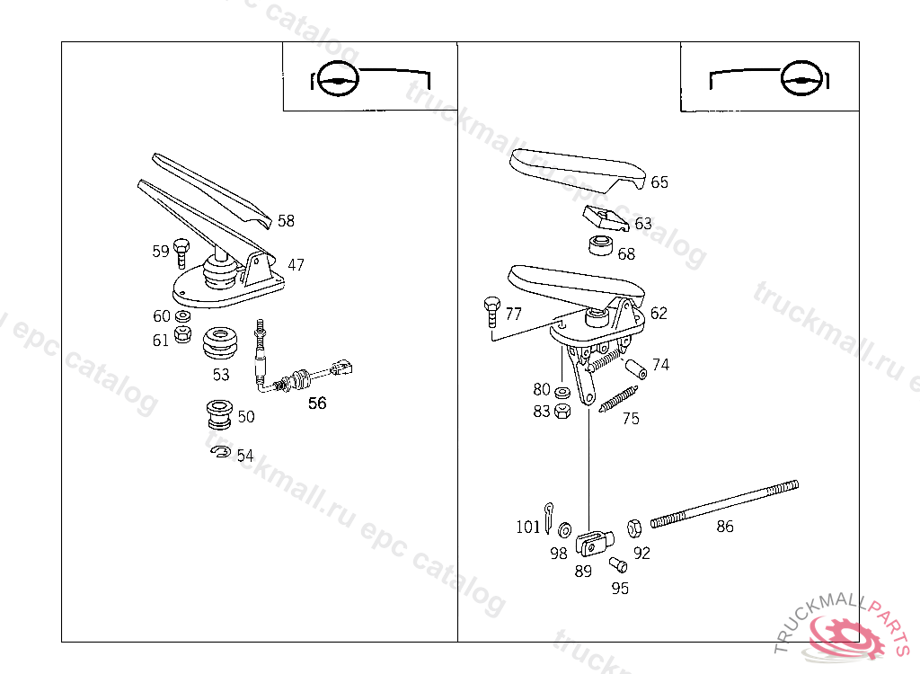BRAKE PEDAL SERVICE BRAKE VALVE, UP TO IDENT NO. 064355 WITH MERCEDES-BENZ BODY UP TO IDENT NO. 064385 WITHOUT MERCEDES-BENZ BODY EXCEPT FOR 063286,063657,063675,063756,064025,064058,064072,064107,064128,064145,064165,064185.