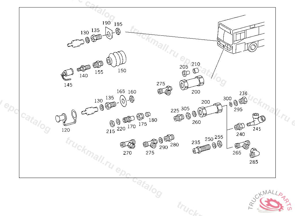 T-FITTING FOUR-CIRCUIT PROTECTIVE VALVE, 9-TO-11-ROW,UP TO CHASSIS 037767 EXCEPT FOR 037449/037495/037527/037575 12-TO-15-ROW,WITH MERCEDES-BENZ BODY,UP TO CHASSIS 037888,LESS MERCEDES-BENZ BODY,UP TO CHASSIS 037898 EXCEPT FOR 301.225/265 301.265 WITH MERCEDES-BENZ BODY UP TO CHASSIS 039438,301.225 LESS MERCEDES-BENZ BODY UP TO CHASSIS 039676