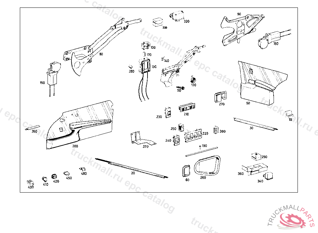 WINDOW REGULATOR RIGHT REAR SIDE, UP TO CHASSIS: 111.021,023 UNTIL PRODUCTION STOP 111.024,025 002863 EXCEPT FOR 002123,002193,002327,002402,002539,002546,002726,002731,002744,002748,002757,002760,002763,002797, 002862.