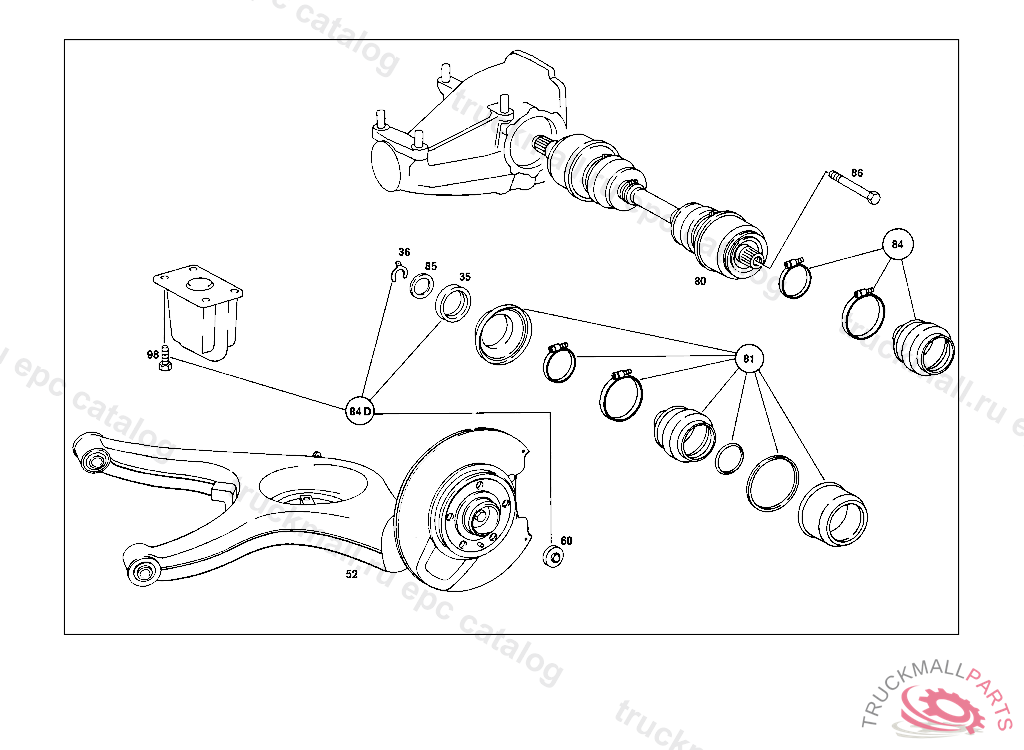 AXLE SHAFT , REAR AXLE HOUSING WITH DIFFERENTIAL AND WITH SIDE BEARING CAPS 003 103238 007 087550 086 007105 093 008991 102,103 240182 105 231728 183 015394 190 021956 193 002092 200 027294 280 000776 283 003631 RIGHT, Replaced By: A1073503310, +001A0149976247