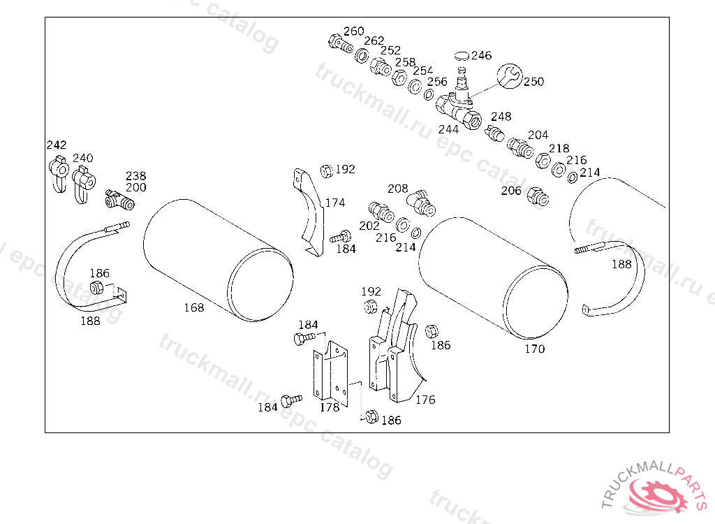 RESERVOIR COMPRESSED AIR 20 L, TO VOSS 232, FOR VEHICLES WITH VOSS 230 CONNECTOR: ADD. MOUNT FITTING "A 004 997 82 72" WITH O-RING "A 000 987 04 46" AND THRUST RING "A 000 997 02 03" TO AIR RESERVOIR