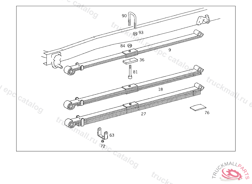 FRONT SPRING , USE U-BOLT + GUIDE PLATE AS REQUIRED (SEE GROUP 32 ,VARIO) ONLY REPLACEABLE BY PAIRS, Replaced By: A6673203202, +001A6673204002, +002A6673220731, +004A6673513825, +004A6673516725