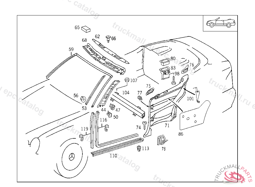 PANELLING LEFT REAR SIDE PART, USED WITH FABRIC TRIM AVANTGARDE, F 129679(COUPE) T 000001(COUPE), T 028296(CABRIO) EXEPT ON VEHICULES WITH CODE 809 ALSO INSTALLED IN VEHICLE TO T 028295, F 129679 WITH CODE 800NO.9B83I NO.5B78I .......I .......I NO.3B92I .......I I