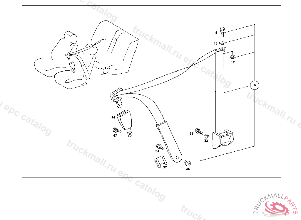 CAP SAFETY BELT SWIVEL FITTING TO SIDE MEMBER, 043 003133 050 001502 053 005956