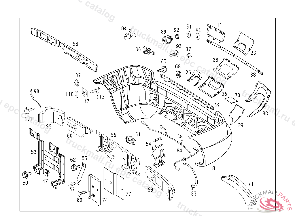 REAR BUMPER FACE BAR REMOVABLE TRAILER COUPLING PARKTRONIC, A 289560 X 754620 EXCEPT CODE 801 ALSO INSTALLED IN VEHICLE TO A 289559, X 754619 WITH CODE 802 TO BE PAINTED PRIOR TO INSTALLATION
