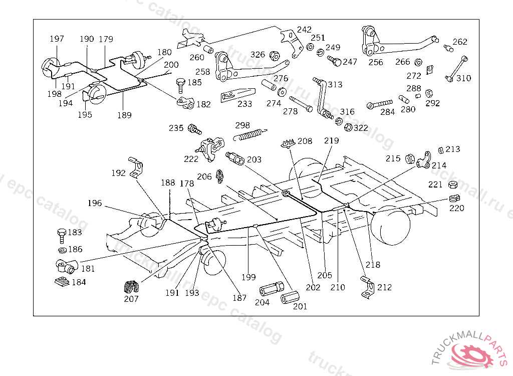 BEARING BRACKET REVERSING LEVER, FROM CHASSIS 289681-499999, ALSO INSTALLED ON 289628,AND USED WITH 3050 MM WHEELBASE FROM CHASSIS 622908 USED WITH 3350 MM WHEELBASE FROM CHASSIS 623314 USED WITH 3700 MM WHEELBASE FROM CHASSIS 624245