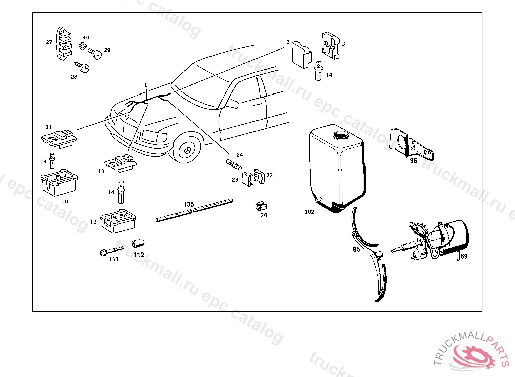 WIPER ASSEMBLY RANGE OF DELIVERY FOR SUBSEQUENT INSTALLATION, ORDER ADDITIONALLY:1 CABLE HARNESS,1 FLUID RESERVOIR,1 PUMP,SEE SA 55872 107.022,042 FROM PRODUCTION START FROM CHASSIS:107.023 009850 107.024 007850 107.043 011508 107.044 021172 ALSO INSTALLED ON: 021165,021170
