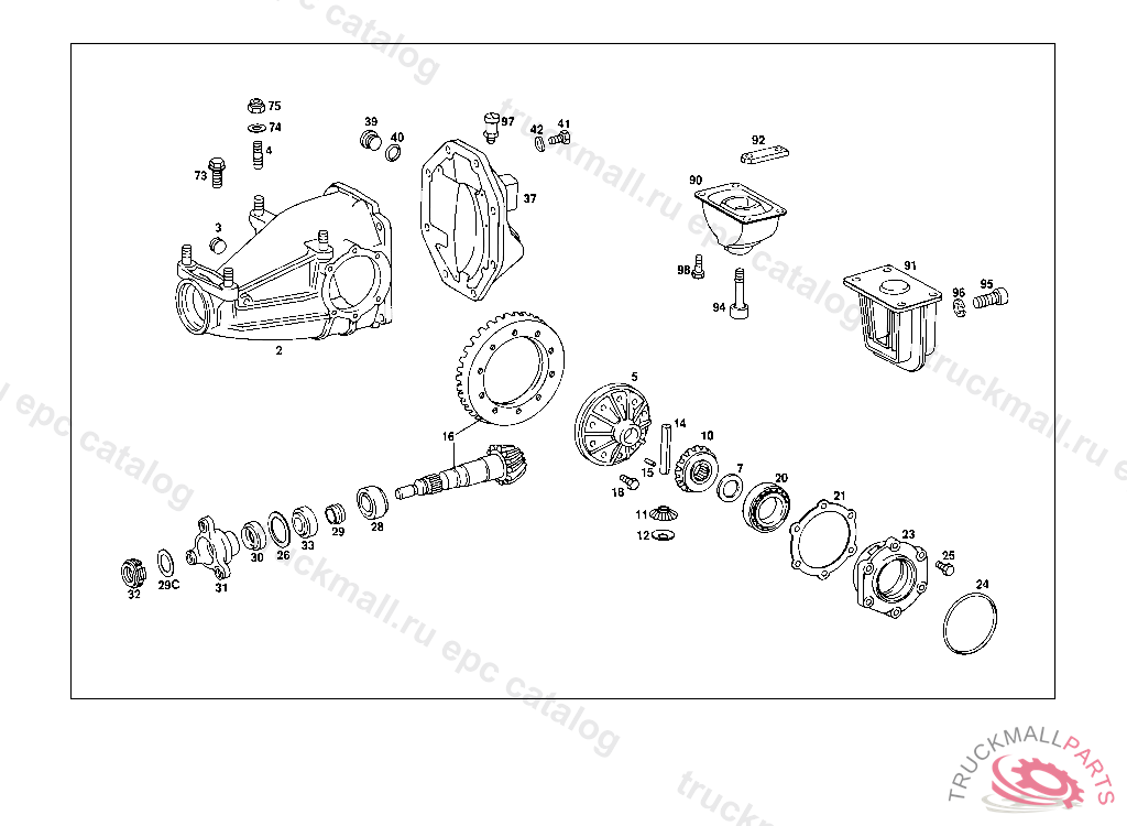 REPAIR KIT REAR AXLE HOUSING WITH DIFFERENTIAL, REAR AXLE HOUSING WITH DIFFERENTIAL AND WITH SIDE BEARING CAPS 003 103238 007 087550 086 007105 093 008991 102,103 240182 105 231728 183 015394 190 021956 193 002092 200 027294 280 000776 283 003631