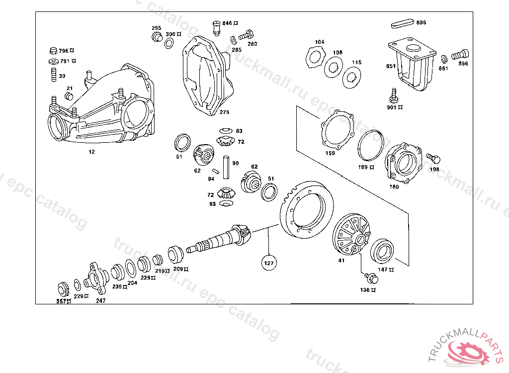 TAPERED ROLLER BEARING RING GEAR BEARING, REAR AXLE HOUSING WITH DIFFERENTIAL AND WITH SIDE BEARING CAPS 003 103238 007 087550 086 007105 093 008991 102,103 240182 105 231728 183 015394 190 021956 193 002092 200 027294 280 000776 283 003631