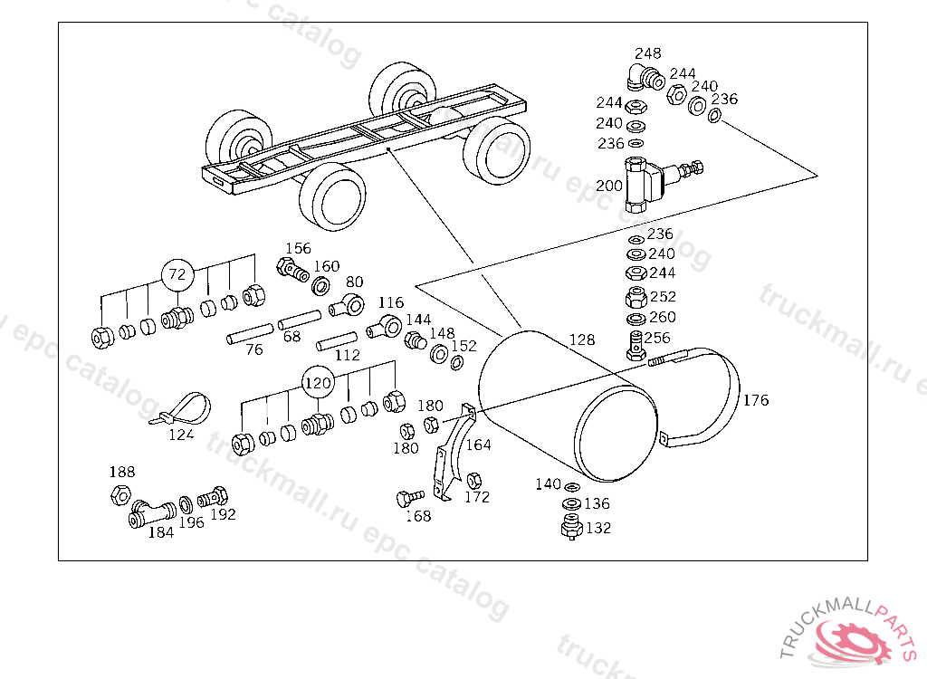 RESERVOIR COMPRESSED AIR 20 L, TO VOSS 232, FOR VEHICLES WITH VOSS 230 CONNECTOR: ADD. MOUNT FITTING "A 004 997 82 72" WITH O-RING "A 000 987 04 46" AND THRUST RING "A 000 997 02 03" TO AIR RESERVOIR