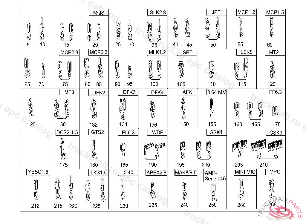 REP.SET CONTACT. CABLE HARNESS REPAIR SOLUTION CONTACTING 0.5 MM2, 203 A 237174 203 F 177685 203 R 028782 210 B 438527 210 X 065665 901-904 R 337627 638 246706 SEE CHASSIS PARTS KIT FOR "FROM VIN" NO. VERBINDER MUESSEN ENTSPRECHEND DEM GESAMT ZU VERBINDENDEN LEITUNGSQUERSCHNITT MITBESTELLT WERDEN. REPARATURANLEITUNG SIEHE WIS LOETENDHUELSEN: A 001 546 99 41GRUEN 0,7 - 2,4 MM2 A 002 546 00 41ROT 2,0 - 4,0 MM2 A 002 546 01 41BLAU3,5 - 8,0 MM2 A 002 546 11 41GELB7,5 - 12,0 MM2 STOSSVERBINDER: A 002 546 13 410,5 MM2 A 002 546 14 410,8 MM2 A 002 546 15 411,3 MM2 A 002 546 16 412,0 MM2