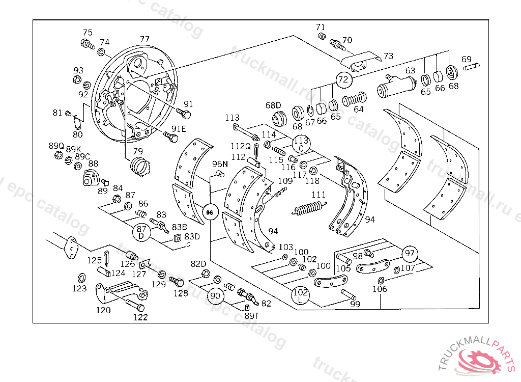 BRAKE SHOE , UP TO CHASSIS 910369 ALSO INSTALLED ON 500001-501455,FROM CHASSIS 910370 AND 501456-599999 SEE SPARE PARTS LIST 103