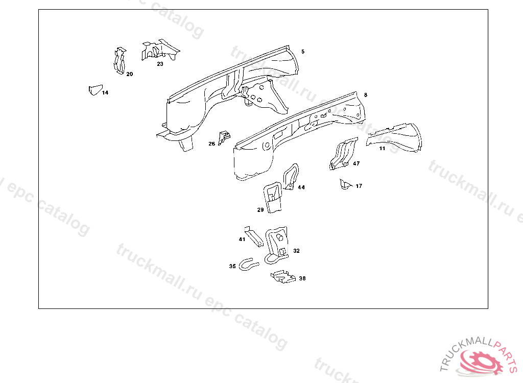 WHEELHOUSE FRONT LEFT, 022 005201 ALSO INSTALLED ON 005190-005192,005194-005199. 023 012497 024 021804 ALSO INSTALLED ON 026 000035 042 004222 ALSO INSTALLED ON 004213,004215-004218,004220. 043 013577 044 047068 ALSO INSTALLED ON 047057,047061,047062,047064-047066.