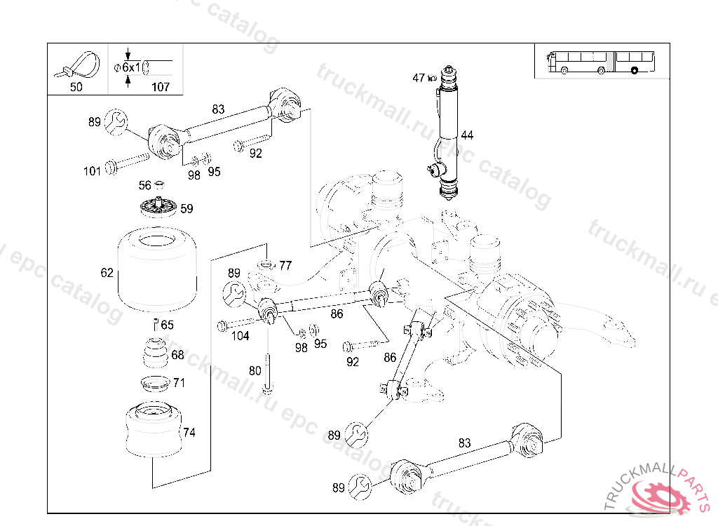 RADIUS ROD (LONGITUDINAL CONTROL ARMS) TOP, ON VEHICLES HAVING NO MERCEDES BENZ BODY FROM IDENT NO. 097836 , 628.000.10.300182, 628.000.14.172141 FOR USE WITH MERCEDES-BENZ BODY FROM IDENT NO. 097976 ALSO INSTALLED ON 300175-300180.
