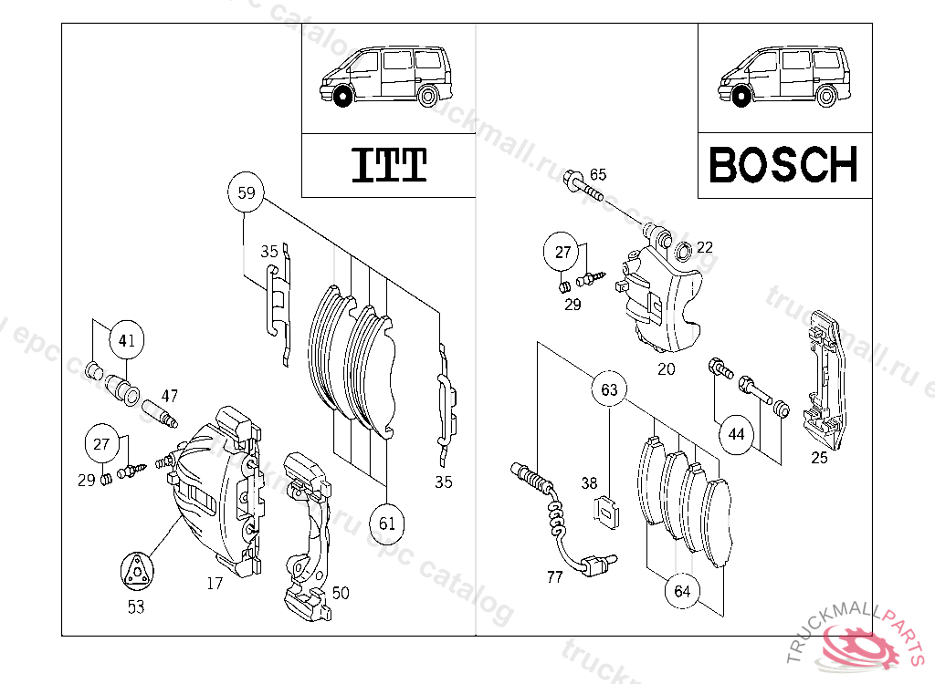 CALIPER RIGHT,WITH LINING "ITT", ONLY REPLACEABLE BY PAIRS REPAIR SOLUTION, 1 X 001 420 62 83, 1 X 001 420 63 83, 1 X 003 420 01 20, 2 X 000 421 08 06