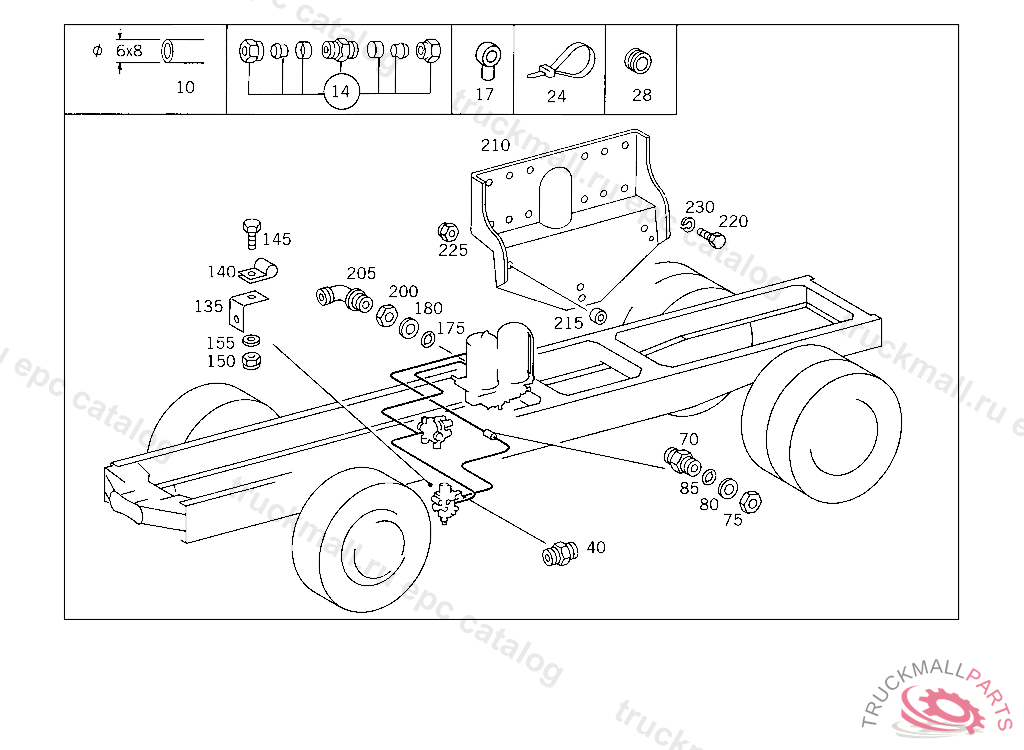 COMPRESSED AIR RESERVOIR. RESERVOIR6 L, TO VOSS 232, FOR VEHICLES WITH VOSS 230 CONNECTOR:ADD. MOUNT FITTING "A 004 997 82 72" WITH O-RING "A 000 987 04 46" AND THRUST RING "A 000 997 02 03" TO AIR RESERVOIR