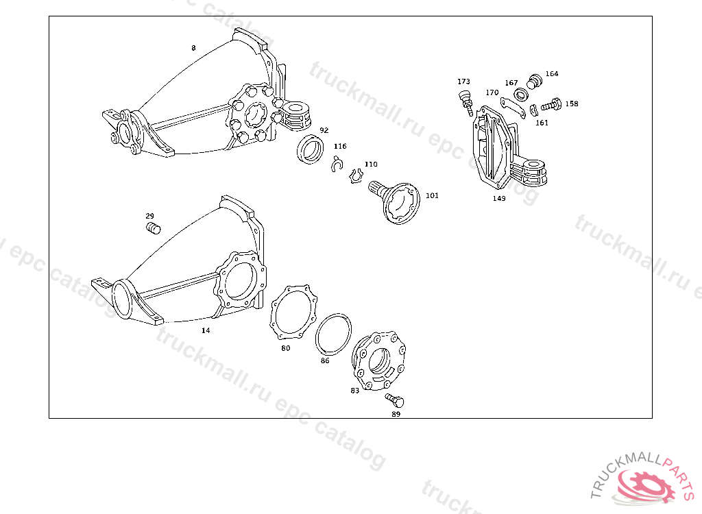 SPACER WASHER AS REQUIRED 2.8 MM, REAR AXLE HOUSING WITH DIFFERENTIAL AND WITH SIDE BEARING CAPS 003 103238 007 087550 086 007105 093 008991 102,103 240182 105 231728 183 015394 190 021956 193 002092 200 027294 280 000776 283 003631