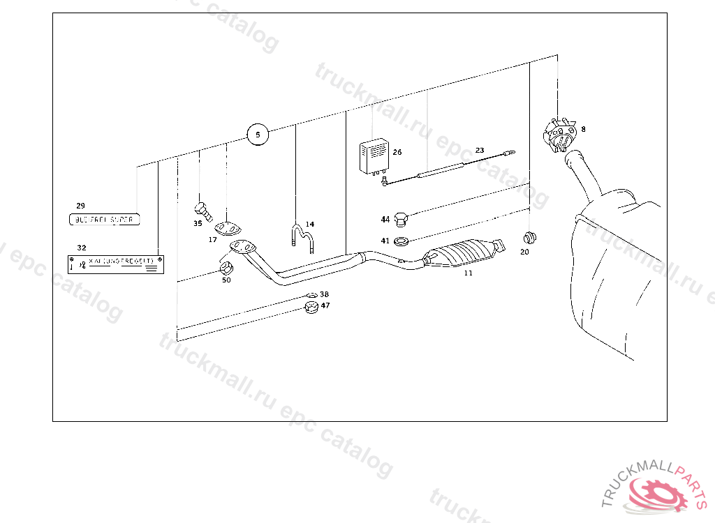 EXHAUST MUFFLER WITH PIPE RANGE OF DELIVERY FOR SUBSEQT. INSTALLATION OF CATALYST LESS OXYGEN SENSOR KUGELFLANSCH "NACHRUESTUNG KAT 90", BEI BESTELLUNG SERVICE-INFORMATION 14/4F VOM 6.2.1987 BEACHTEN A 136174 F 025325 EXCEPT FORF 034672,F 036197