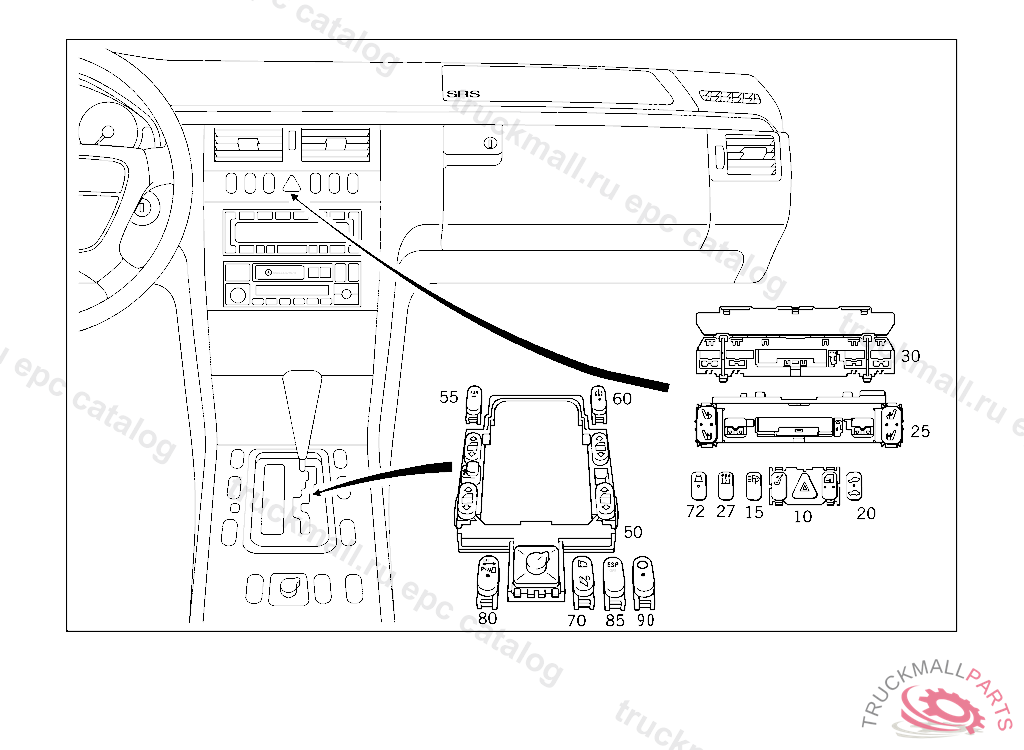 SWITCH 4 WINDOW LIFTS WITH TRUNK LID REMOTE CONTROL LOCKING AND MIRROR ADJUSTMENT, F 758208 EXCEPT CODE 808 ALSO INSTALLED IN VEHICLE TO F 758207 WITH CODE 809 NO.7C45