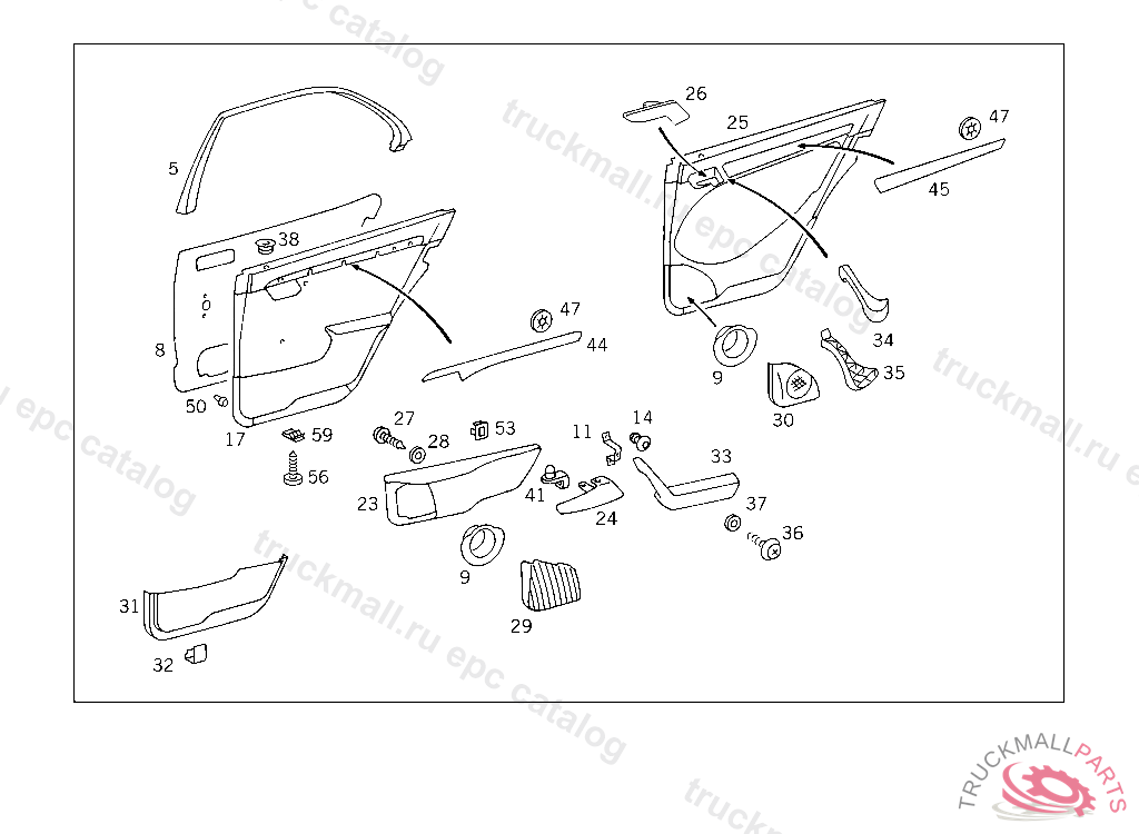 PANELLING RIGHT REAR DOOR, USED WITH IMITATION LEATHER TRIM, A 519674 F 619721 EXCEPT CODE 807 ALSO INSTALLED IN VEHICLE TO A 519673, F 619720 WITH CODE 808 NO.9B12 INO.5B29 INO.8G01 INO.8G06 I....... INO.7D03 I