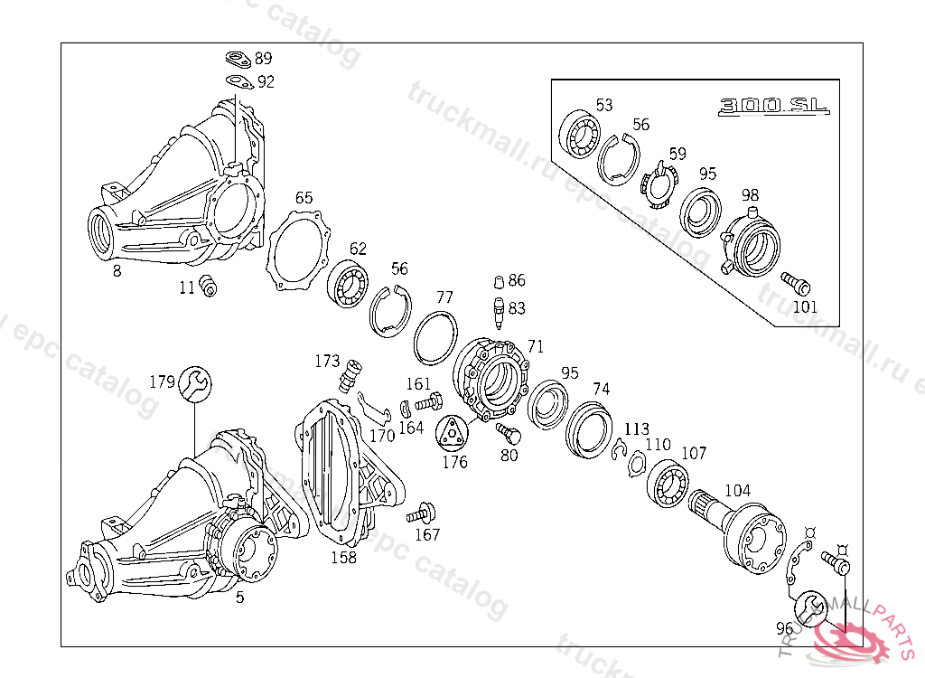 SPACER WASHER AS REQUIRED 3.3 MM, REAR AXLE HOUSING WITH DIFFERENTIAL AND WITH SIDE BEARING CAPS 003 103238 007 087550 086 007105 093 008991 102,103 240182 105 231728 183 015394 190 021956 193 002092 200 027294 280 000776 283 003631