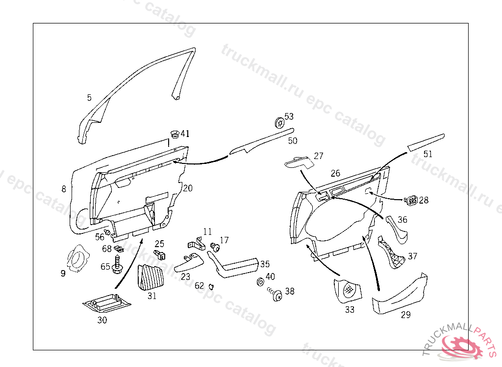 PANELLING RIGHT FRONT DOOR,WITH DOOR POCKET, USED WITH FABRIC TRIM SPORT, IN CASE OF VEHICLES LESS COURTESY LAMP, ORDER ADDITIONALLY: 1X 210 727 02 88 USED WITH ELECTRIC SEAT ADJUSTER A 344661 F 331441 EXCEPT CODE 805 ALSO INSTALLED IN VEHICLE TO A 344660, F 331440 WITH CODE 806 A 519673 F 619720 EXCEPT CODE 808 ALSO INSTALLED IN VEHICLE FROM A 519674, F 619721 WITH CODE 807 NO.9B78 I....... I....... I....... I....... I....... I