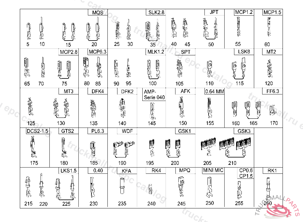REP.SET CONTACT. CABLE HARNESS REPAIR SOLUTION CONTACTING 0.75 MM2, 203 A 237174 203 F 177685 203 R 028782 210 B 438527 210 X 065665 901-904 R 337627 638 246706 SEE CHASSIS PARTS KIT FOR "FROM VIN" NO. VERBINDER MUESSEN ENTSPRECHEND DEM GESAMT ZU VERBINDENDEN LEITUNGSQUERSCHNITT MITBESTELLT WERDEN. REPARATURANLEITUNG SIEHE WIS LOETENDHUELSEN: A 001 546 99 41GRUEN 0,7 - 2,4 MM2 A 002 546 00 41ROT 2,0 - 4,0 MM2 A 002 546 01 41BLAU3,5 - 8,0 MM2 A 002 546 11 41GELB7,5 - 12,0 MM2 STOSSVERBINDER: A 002 546 13 410,5 MM2 A 002 546 14 410,8 MM2 A 002 546 15 411,3 MM2 A 002 546 16 412,0 MM2