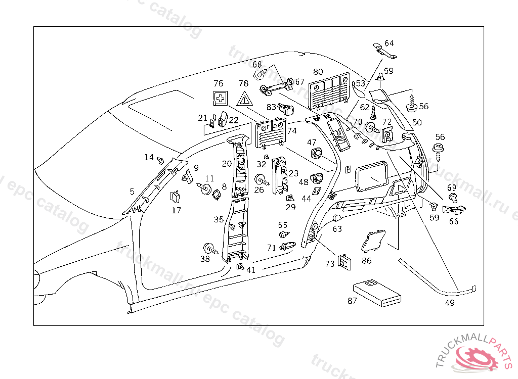 PANELLING B-PILLAR ON THE RIGHT, A 145273 X 707756 EXCEPT CODE 809 ALSO INSTALLED IN VEHICLE TO A 145272, X 707755 WITH CODE 800.......I .......INO.9B96INO.7E33 INO.1A68 INO.9B96 I .......I .......I .......I .......I