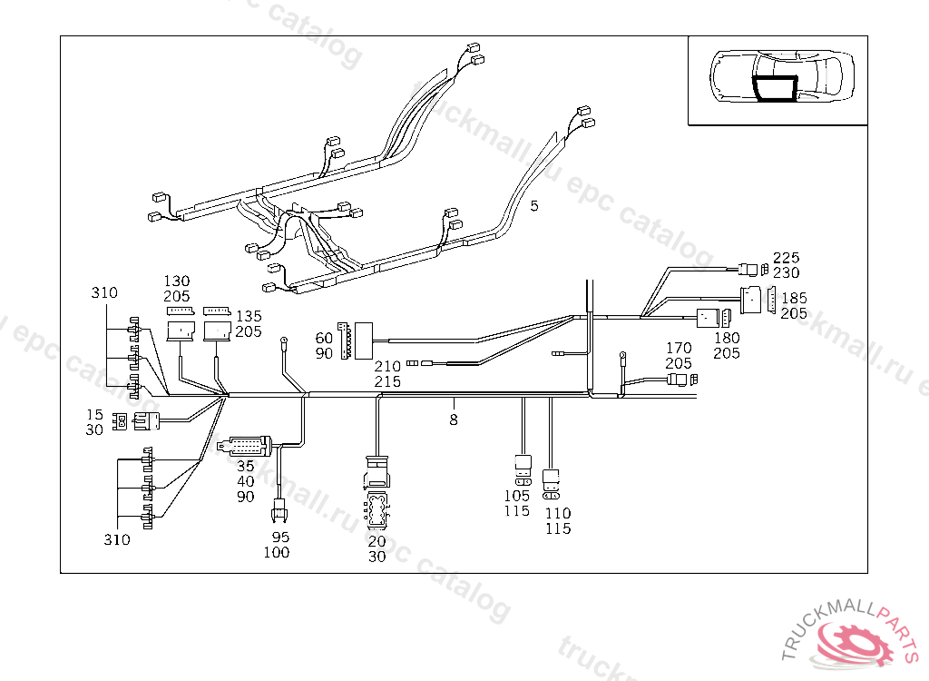 CABLE HARNESS FRAME FLOOR UNIT ET: 208 540 96 08,F 075409 F 129678 (COUPE) T 028295 (CABRIO) EXCEPT CODE 800 ALSO INSTALLED IN VEHICLE TO F 129679, T 028296 WITH CODE 809