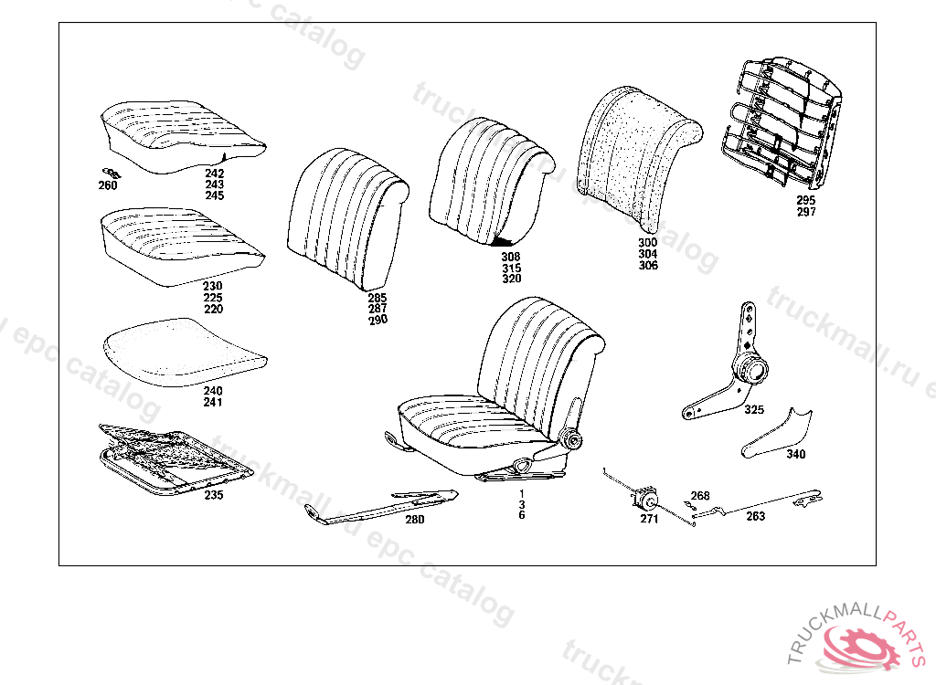 SEAT CUSHION , STATE COLOR NUMBER WHEN ORDERING AND PLEASE STATE WHETHER FRONT SEAT BACKREST SHOULD BE MADE READY FOR INSTALLATION OF HEADRES T UP TO CHASSIS: 108.012 074611 108.016 024092 108.018 024378 108.019 024266