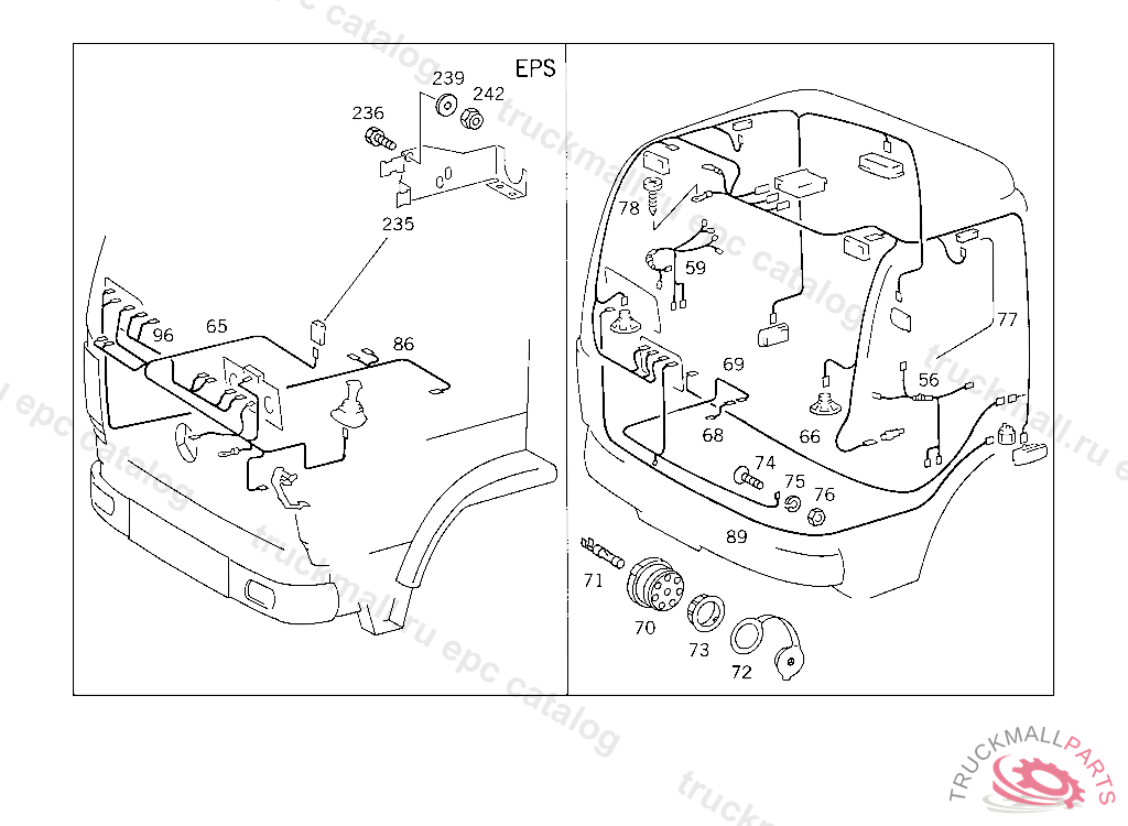 CABLE HARNESS FROM CHASSIS PLUG CONNECTION TO TRANSMISSION PLUG CONNECTION EPS-E, THIS CABLE HARNESS IS A COMPONENT OF FRAME MOUNTED CABLE HARNESS ASSEMBLY AND CAN BE MADE AVAILABLE AS A SPARE ATTENTION: WHEN PLACING ORDERS, PLEASE QUOTE VEHICLE IDENT NO. ONLY IF FRAME MOUNTED CABLE HARNESS IS REQUIRED AS AN ASSEMBLY5 957780K 041928