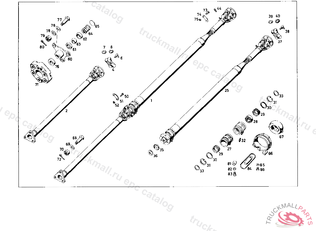 PROPELLER SHAFT WITH INTERMEDIATE BEARING, WITHOUT MOUNTING BRACKET, RUBBER MOUNTING AND CENTERING CROSS