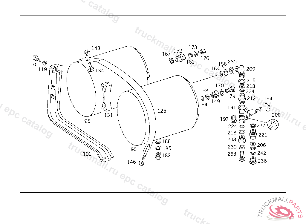 RESERVOIR COMPRESSED AIR 20 L, TO VOSS 232, FOR VEHICLES WITH VOSS 230 CONNECTOR: ADD. MOUNT FITTING "A 004 997 82 72" WITH O-RING "A 000 987 04 46" AND THRUST RING "A 000 997 02 03" TO AIR RESERVOIR